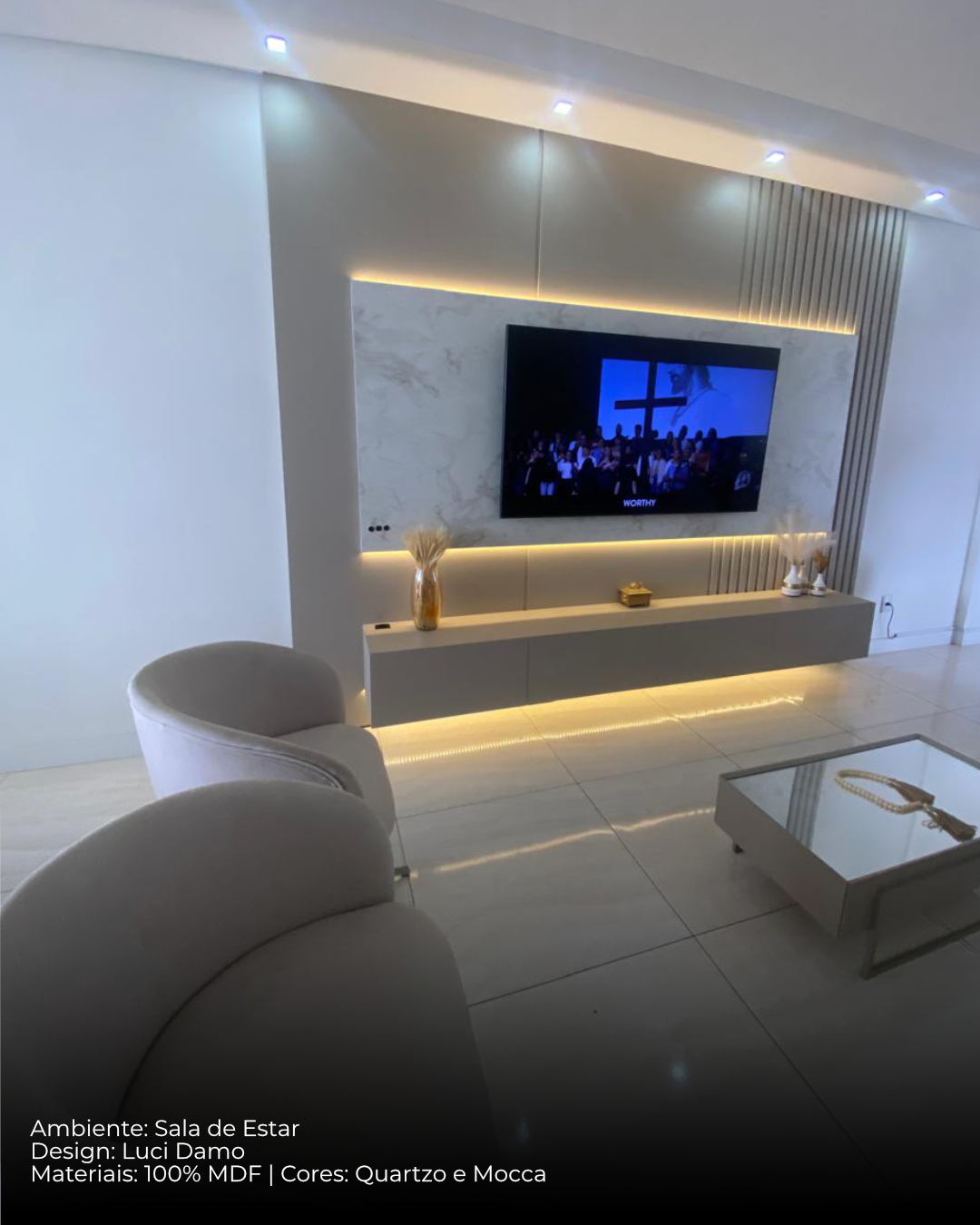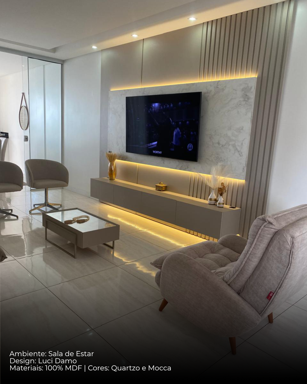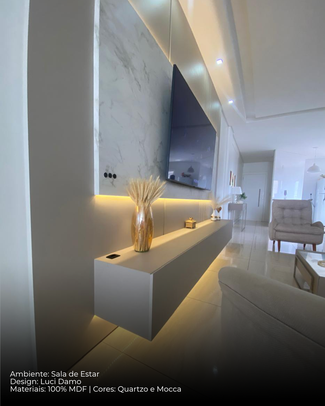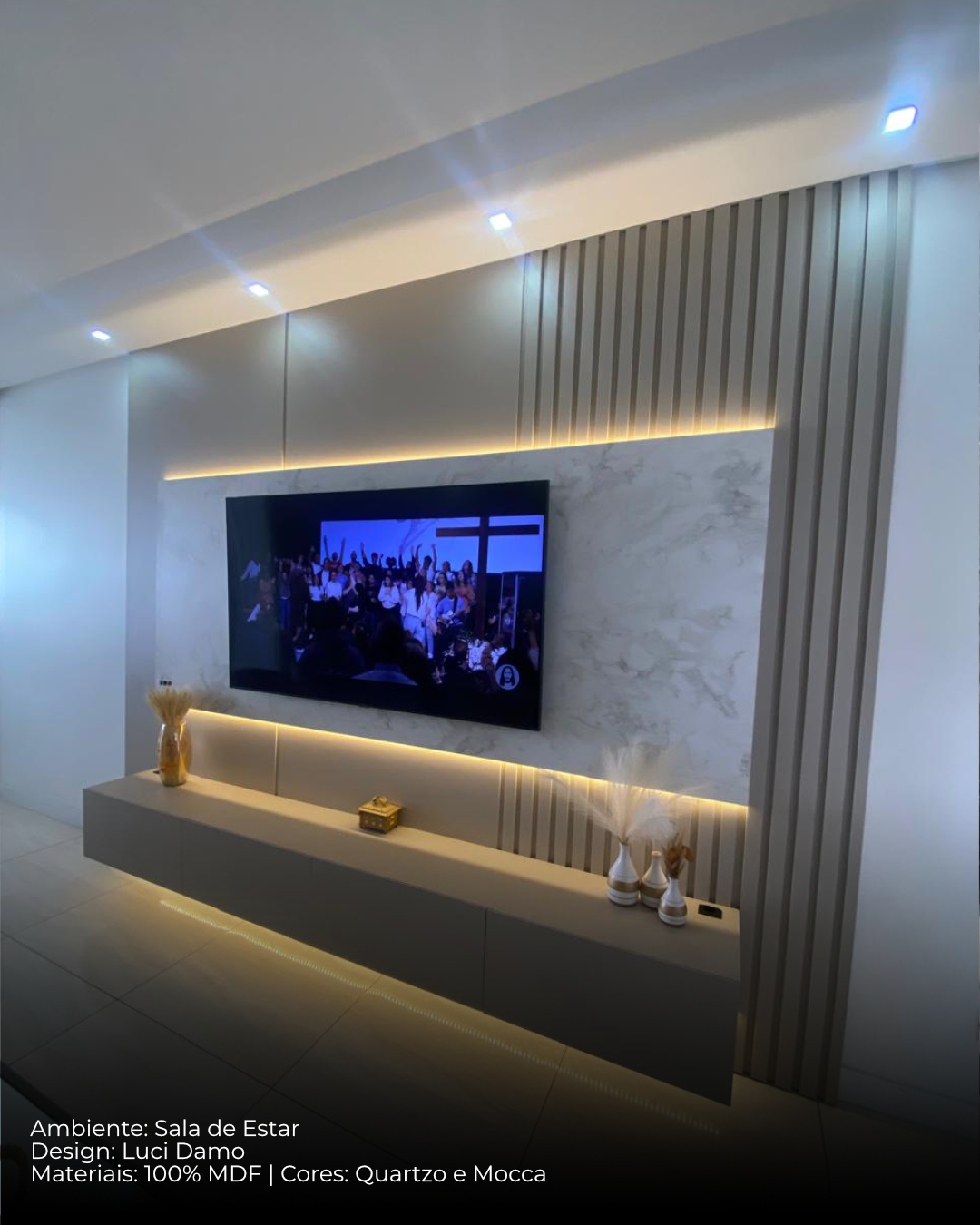 Este painel de sala planejado foi desenvolvido para criar um ambiente moderno, aconchegante e sofisticado, valorizando o espaço e proporcionando um visual elegante e funcional.